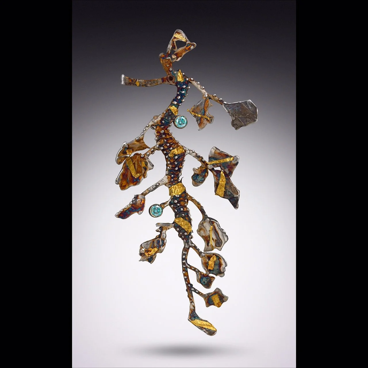 The techniques involved with these pieces is a lot of serendipity. Each piece is individually hand-sculpted in wax, sometimes from an initial pencil drawing or sketch, but never with recourse to any computer or mold duplication. They are then cast on a centrifugal caster or gravity pour in the lost-wax casting process. After polishing and depletion gilding the sterling silver, 24k gold leaf is sometimes applied (Kuem-boo) by hand with a stone burnishing tool and tweezers. Some pieces are hammered and further manipulated with hand tools such as saws, files and engravers, and accenting stone settings or findings added by torch soldering. Colorful patinas are then induced, again with a lot of serendipity. No two look completely alike, they come out as these entities wish to be revealed!